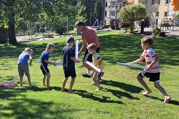 Spielleiter Wurmi begrüßte die teilnehmenden Väter und Kinder mit Kennenlernspielen, bei denen sich alle rasch näherkamen und Berührungsängste abgebaut werden konnten. Im Laufe des Abends wurde gemäß dem Motto der Vater-Kind-Wochenenden nur gespielt – Geschicklichkeitsspiele, Kooperationsspiele, Gruppenspiele, …